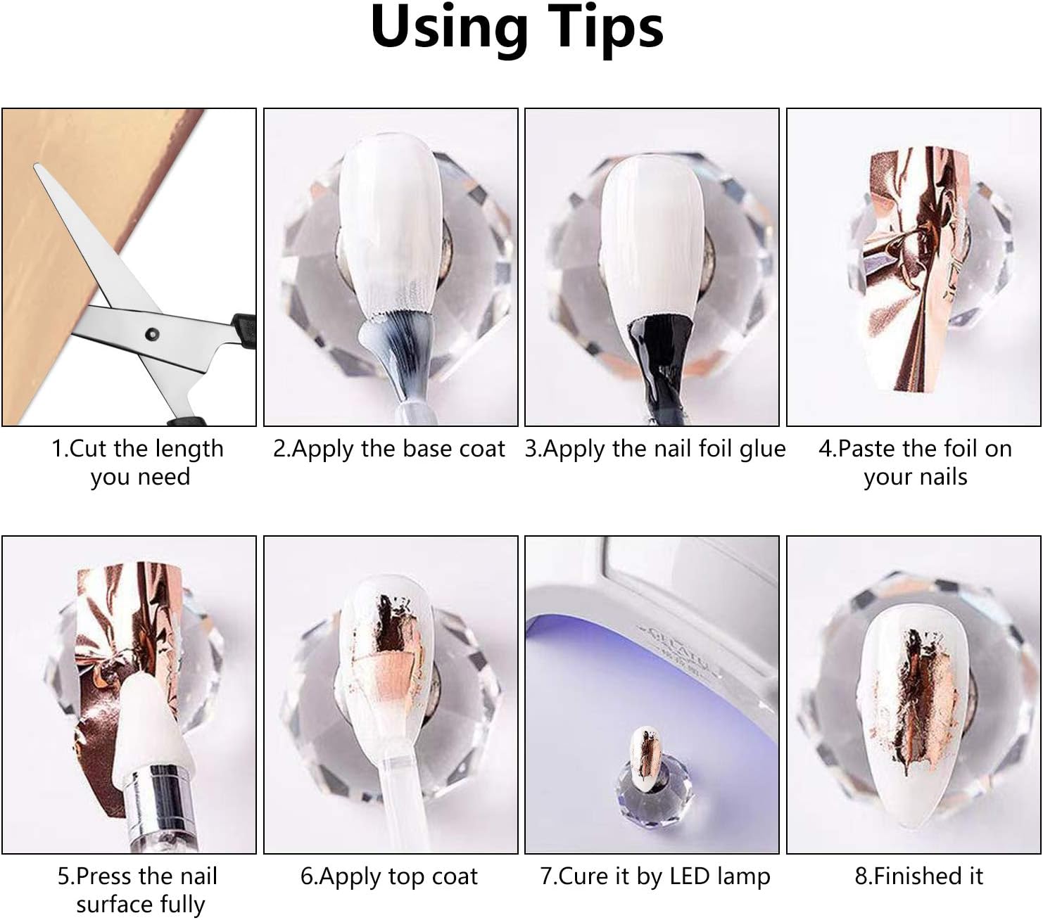 Easy to Use: apply the foil glue and wait for 5 min (make sure the foil glue turns clear); cut a piece of the nail decals and press it on your nail; peel the backing off and the sticker will transfer on your nail,you will find that your nails are getting charming and attractive. It can be used for regular polish and UV gel polish.