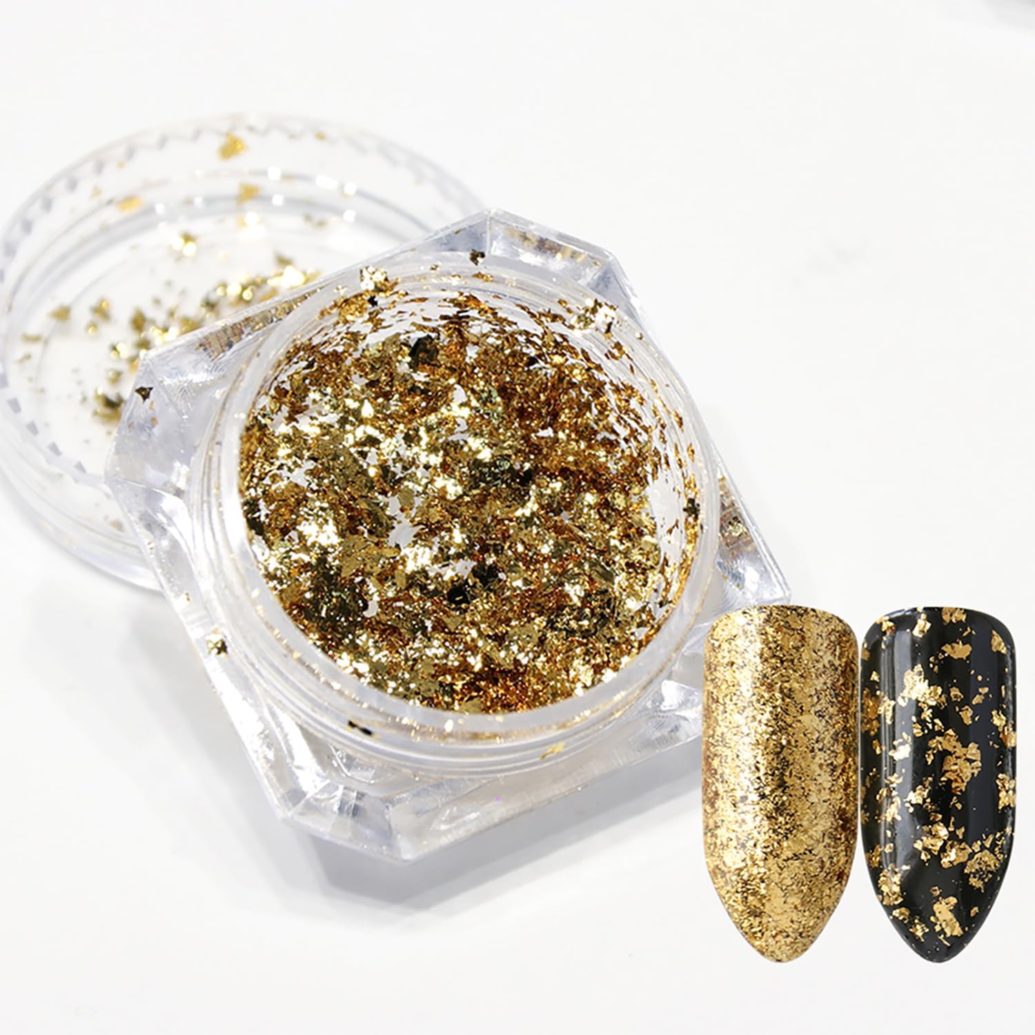 Package: Packaging includes 2 bottles in golden flash gold foil this foil set comes in 2 style(complete foil flakes and irregular gold flakes). The individual bottle packaging makes it convenient for you.